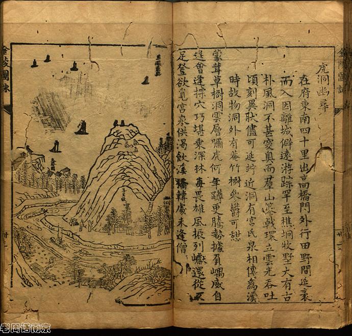 《金陵圖詠》之“虎洞幽尋” 據1624年明·朱之蕃編陸壽柏畫的《金陵圖詠》之“虎洞幽尋”記載:在府(南京)东南四十里,出高桥门外,行田野间,延袤而入。因离城僻远,游踪罕至,樵坰牧墅,大有古朴风洞,不甚窔奥。而群山篸戟环立,云光吞吐,顷刻异状,儘可延竚,近洞有宮氏泉,相傳為漢時故物,洞外有菴,竹樹參欝,可憇。 并配詩作如下: 蒙茸草樹洞雲層 嘯虎何年蹲更騰 勢據負嵎威自逞 會逢探穴巧堪乘 深林毐畏雄風振 列巘還從歹足登 欲覓宮泉供渴飲 溪橋轉處未逢僧