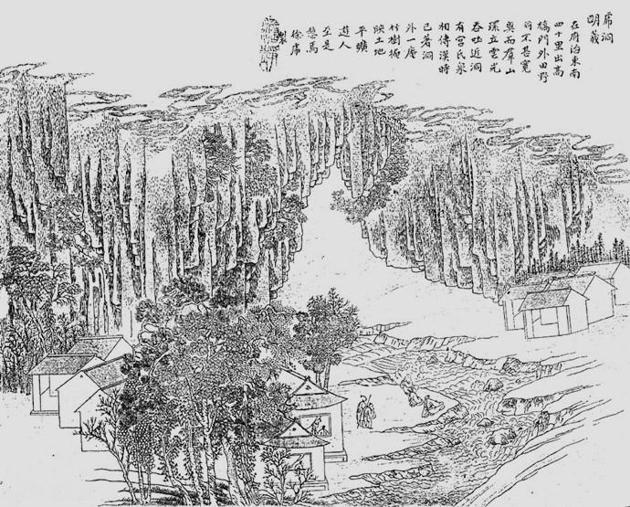 清·長干客之“虎洞明曦”圖 清·同治年间一位自稱长干客的画家,曾把这一景写入他的画卷,并题曰:虎洞明曦,在府治(即南京)东南四十里,出高桥门田野。洞不甚宽奥,而群山环卫,云光吞吐。近洞有宫氏泉,相传汉时已著。洞外一庵,竹树掩映,土地平旷,游人至是憩焉。
