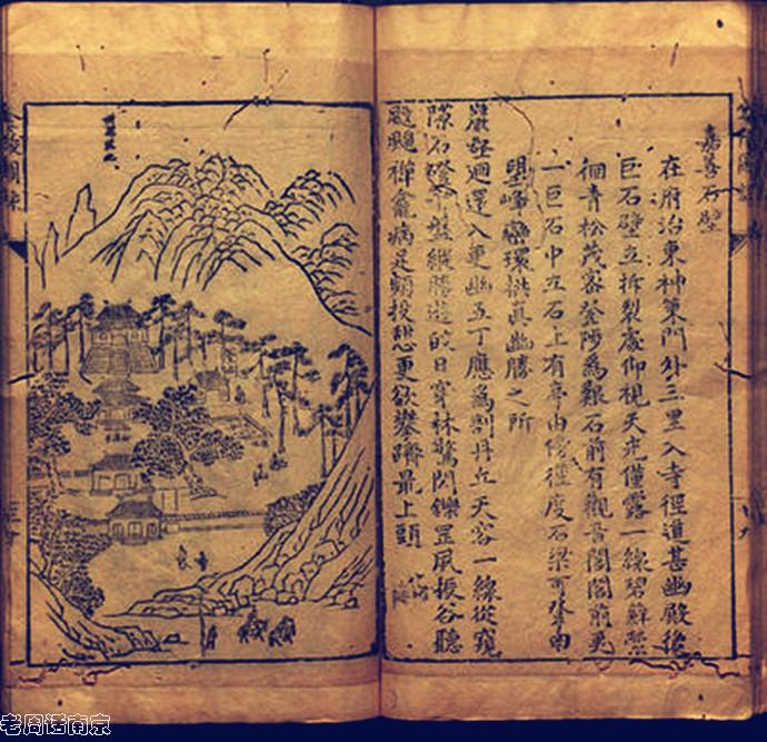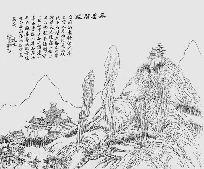 ![]() 南京·嘉善寺 金陵四十八景之“嘉善聞經”,說的是南京幕府山东南铁石岗石佛阁上的嘉善寺。 嘉善寺,据民國徐寿卿编、韵生绘的《金陵四十八景全图》载:在府治東,神策門外三里。入寺曲徑通幽,殿後巨石壁立,偪仄之處仰視天光,僅露一線。上有石佛、觀音諸閣,閣前一巨石中立,石上復建一亭。由旁逕以達石梁,曲折皆通,真尋幽之奇境也。今石尚存,而殿宇荒蕪矣。 民國《金陵四十八景全圖》嘉善聞經 在明末朱之蕃编、陆寿柏绘、杜士全和诗的《金陵四十景图像诗咏》中,该景名为“嘉善石壁”。介绍中,地点一样,解释略异:在府治東,神策門外三里。入寺迳道甚幽,殿后巨石壁立,拆裂处,仰视天光,仅露一线,碧藓萦徊,青松茂密,登陟为艰。石前有观音阁,阁前更一巨石中立,石上有亭,由旁径度石梁可登,四望峰峦环拱,真幽胜之所。