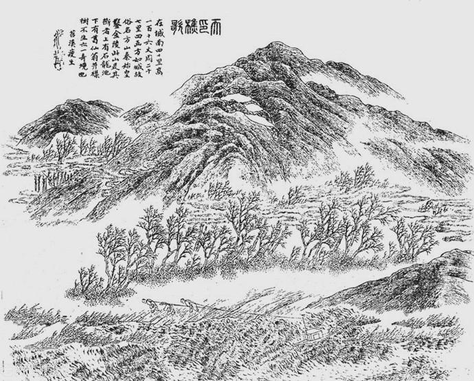 據1920年畫家長干里客·徐虎《金陵四十八景圖》之“天印樵歌”題:在城南四十里,高一百十六丈,周二十七里。四面方如城,故俗名方山。秦始皇鑿金陵,此山是其斷者。上有石龍池,下有葛仙翁井,雜樹不生,亦一奇境也。
